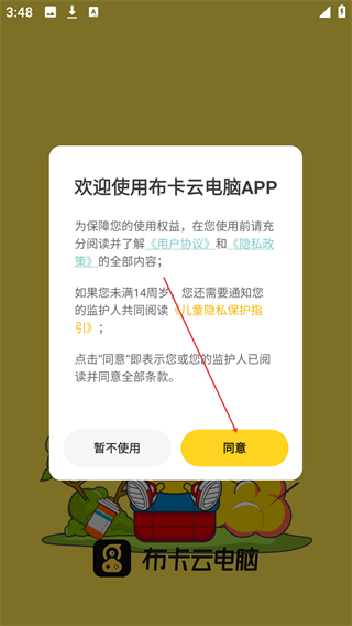1、打开布卡云电脑APP,在欢迎协议弹窗中点击【同意】,进入应用引导页。