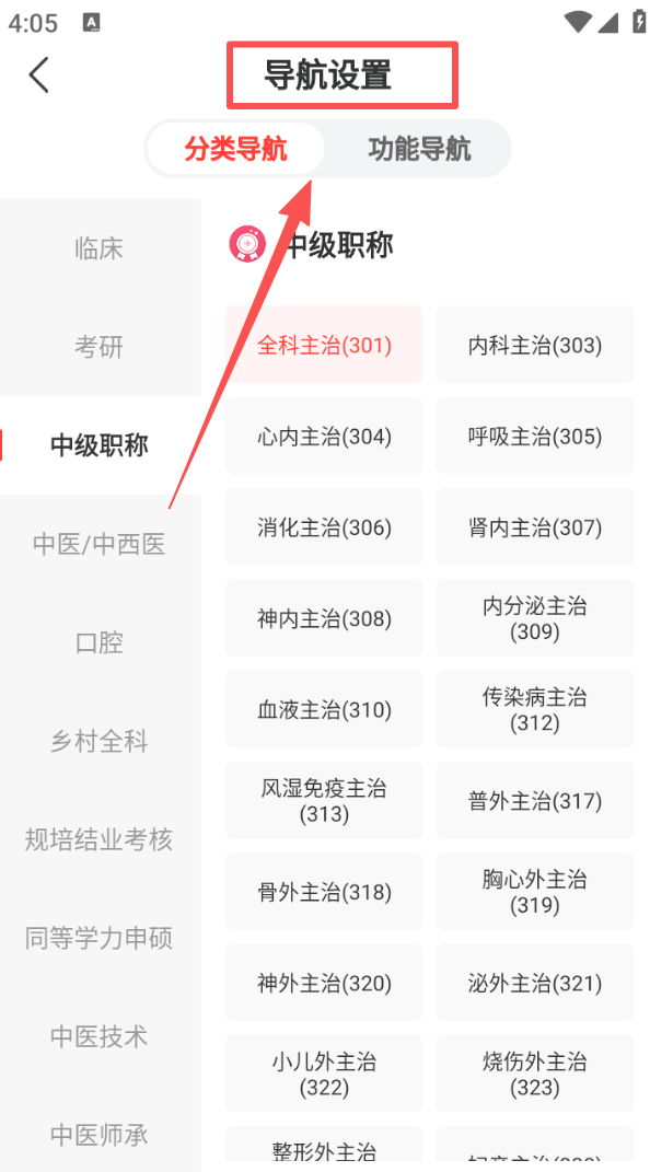 1、在软件首页,点击顶部的选项,例如“全科主治 (301)”,可自主选择其他选项,进入导航设置页面。