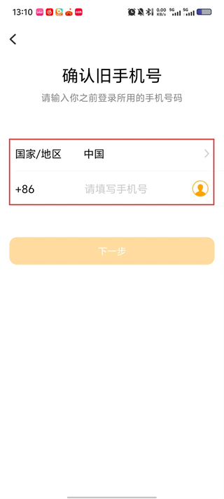 4、在确认旧手机号页,选择【国家/地区】(默认中国),填写之前登录的手机号,点击【下一步】,继续完成手机号更换的后续验证步骤。