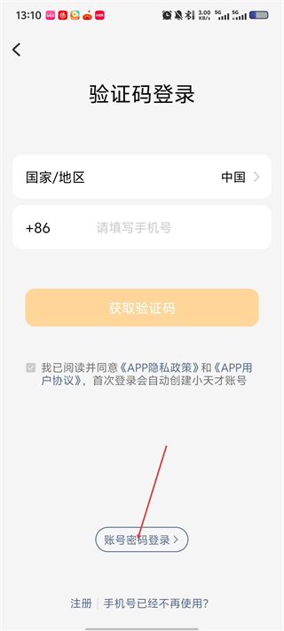 3、在验证码登录页,若选择密码登录,点击【账号密码登录】,跳转至密码登录界面。