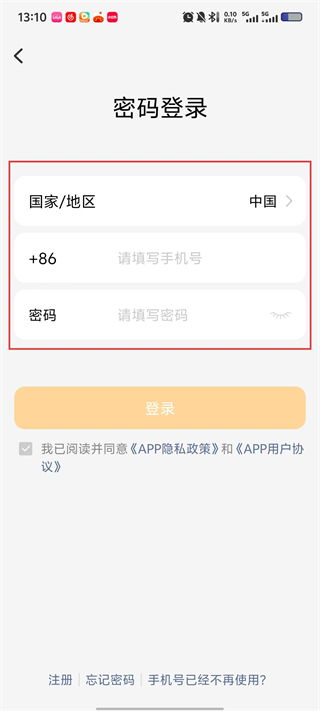 4、在密码登录页,选择【国家/地区】(默认中国),填写手机号与密码,勾选协议后点击【登录】完成账号登录。