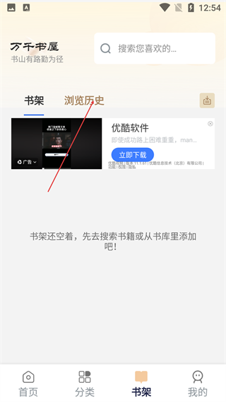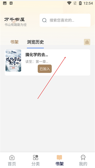 2、在书架页面中,切换至【浏览历史】标签页,找到已加入的目标书籍条目。