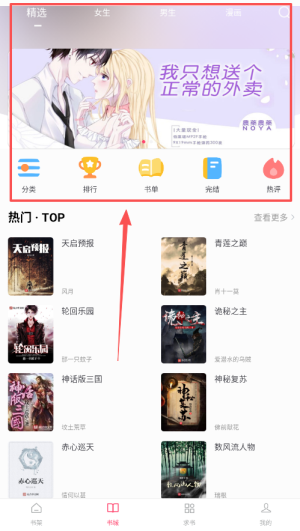 1、下载软件之后进入到书城精选页面,可以看到有精选、女生、男生、漫画分类,更有排行、书单、完结、热评小说漫画;