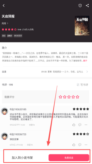 3、选择一本自己喜欢的小说进入到界面,可以看到小说简介和网友评论,点击免费阅读便可开始观看;