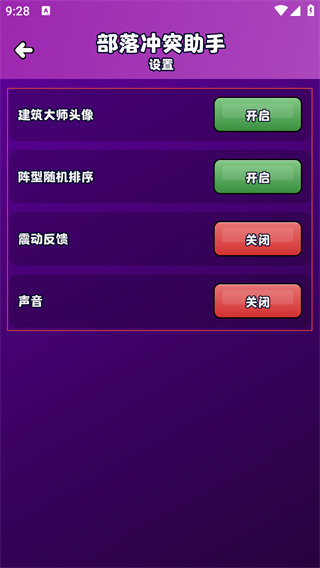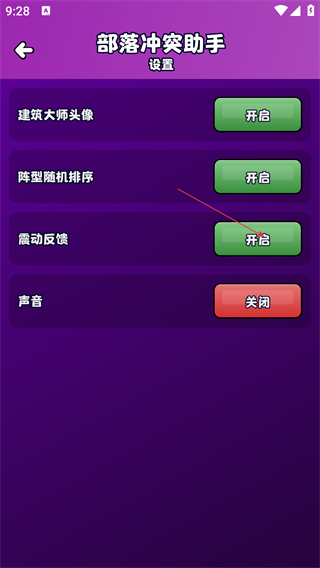 3、在设置界面,可看到“建筑大师头像”“阵型随机排序”“震动反馈”“声音”等功能开关,当前“震动反馈”处于开启状态。