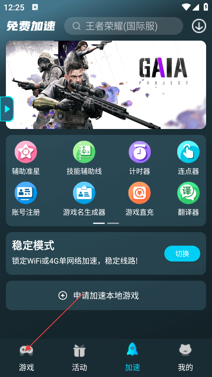 1、打开好猫加速器APP,进入主界面后,点击底部导航栏中的【游戏】选项。
