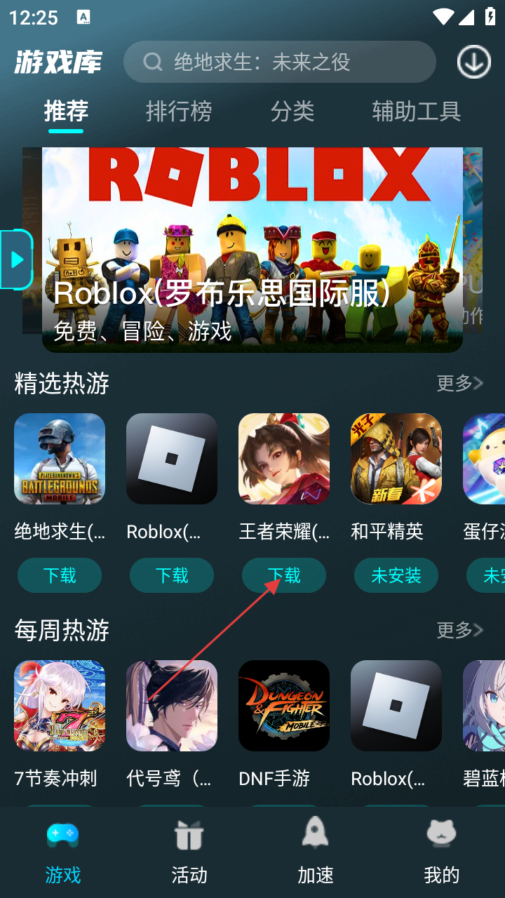 2、进入游戏库页面,在“精选热游”区域找到《王者荣耀(国际服)》,点击其下方的【下载】按钮。