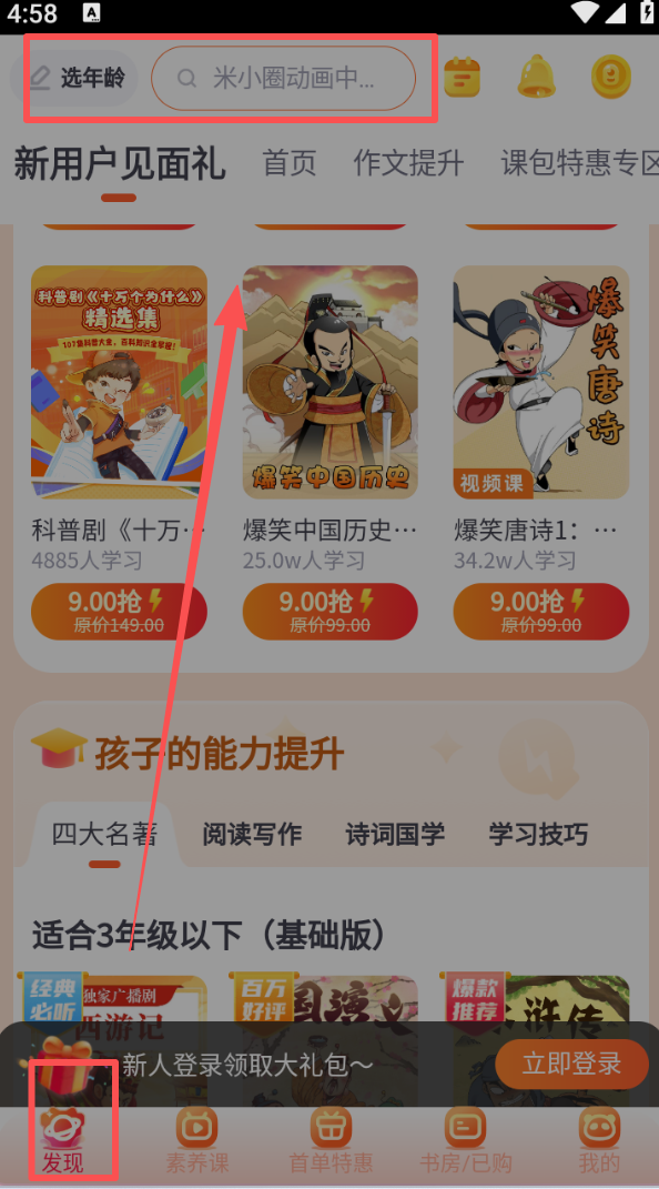 1、在 “发现” 页面,点击顶部搜索框,查找课程。
