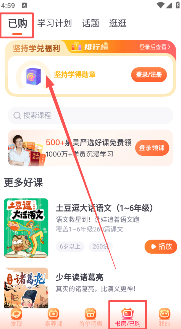 3、切换到 “书房 / 已购” 板块,在 “已购” 分类下,可查看已购买的课程及坚持学习福利活动。