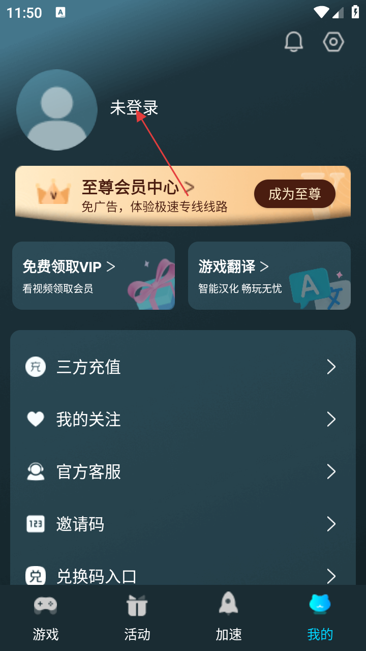 3、在“我的”页面,点击【未登录】区域,进入用户登录页面。