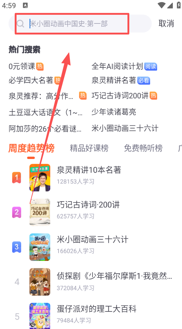 2、进入搜索页面后,能看到热门搜索和各类榜单,可从中选择感兴趣的课程。