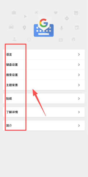 3、进入谷歌输入法设置界面,可对语言、键盘设置、主题背景等多项功能进行调整。