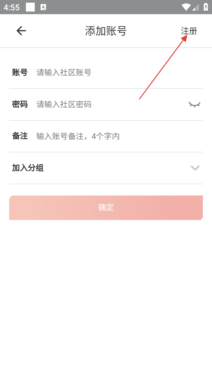 1、在添加账号页面,点击右上角【注册】,进入注册社区账号流程,可创建新账号。