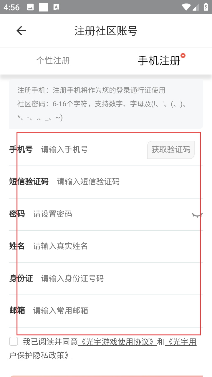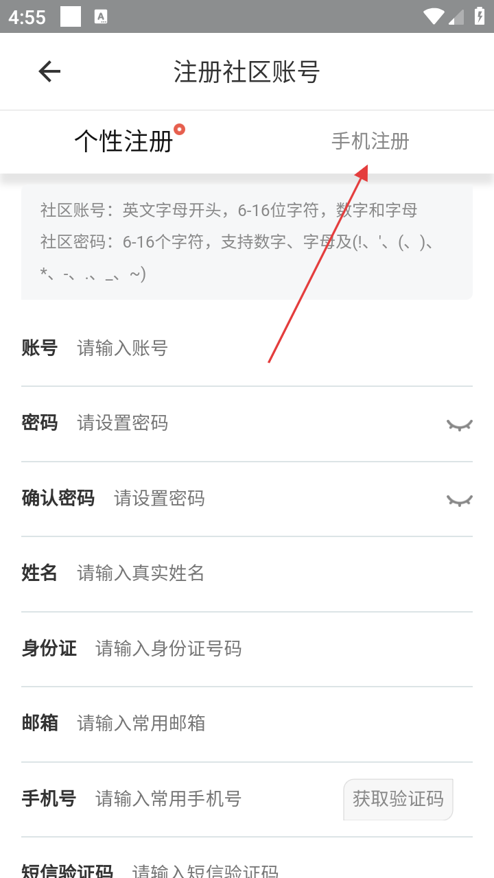 2、在注册社区账号页面,点击【手机注册】,切换至手机注册方式,方便快捷注册账号。