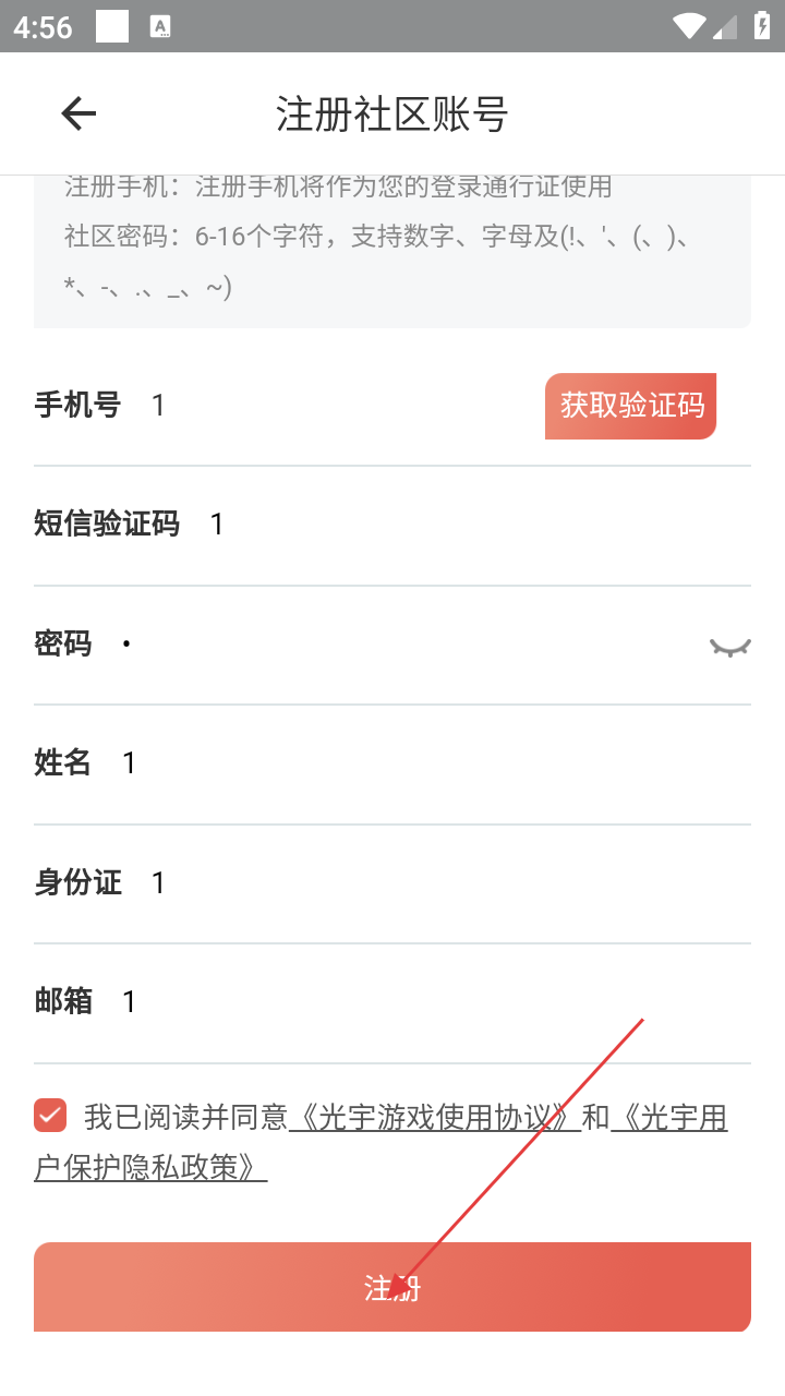 4、输入所有信息并勾选同意协议后,点击【注册】,即可完成社区账号注册操作。