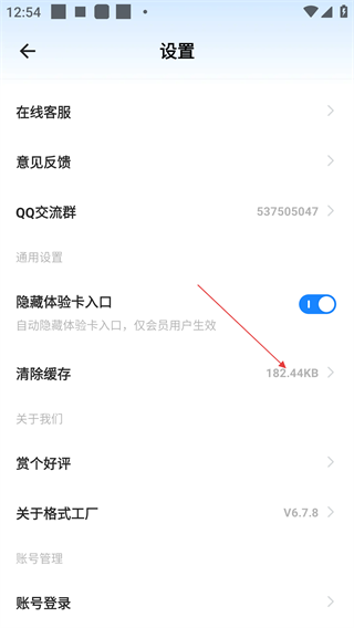 3、在【设置】页面中,找到【清除缓存】选项,点击可清理182.44KB的缓存数据,提升应用运行流畅度。