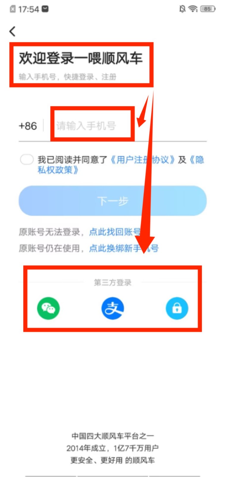 1、进入登录页面,可输入手机号完成登录注册,也能选择微信等第三方账号快速登录平台。