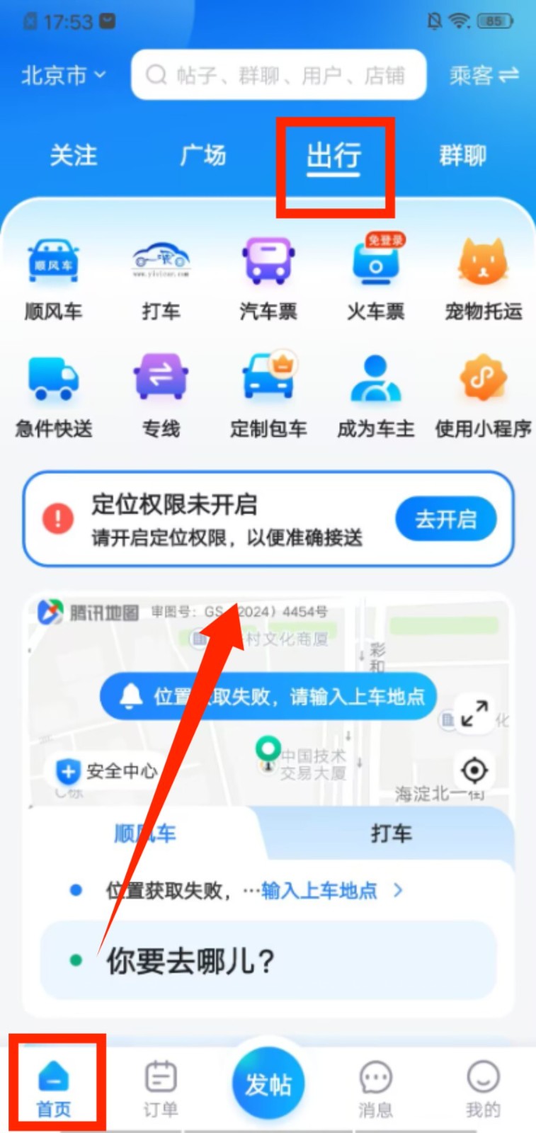 2、切换到首页的出行板块,在 “顺风车”“打车” 等功能栏中,可选择对应的出行服务,开启行程规划。
