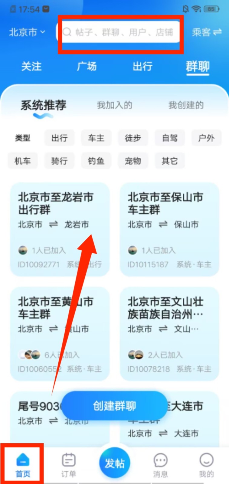 3、打开群聊页面,通过搜索栏查找相关群聊,也能加入系统推荐的出行、车主类群聊交流信息。