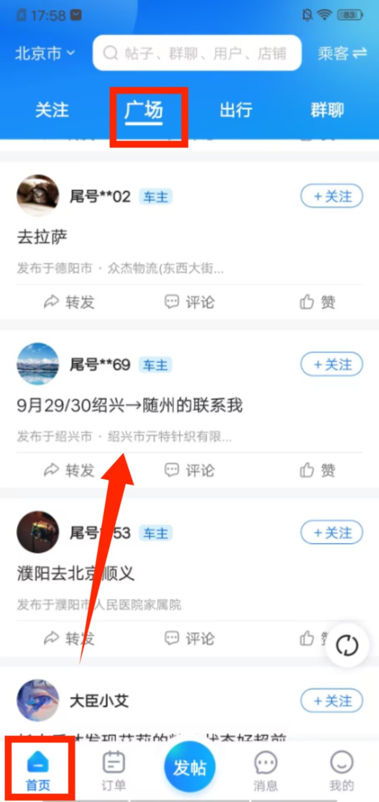 4、进入广场页面,浏览车主发布的行程信息,可对内容进行转发、评论或点赞,参与互动交流。