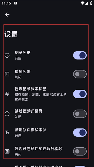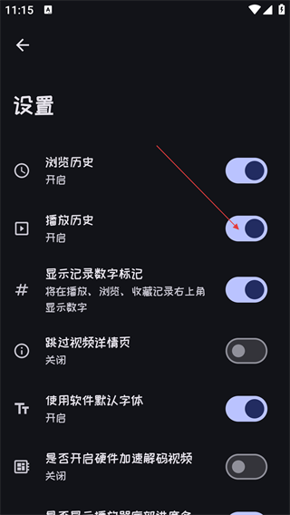 3、进入设置页面,可开启或关闭【浏览历史】【播放历史】等功能。