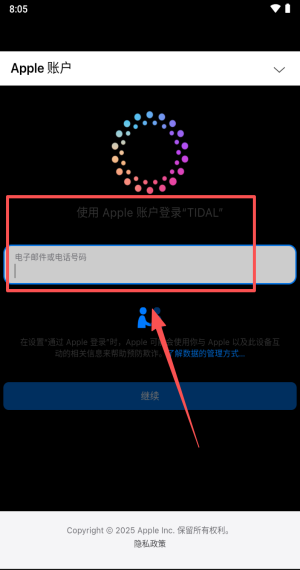 4、若用苹果账号,输邮箱电话确认即可安全登录TIDAL。