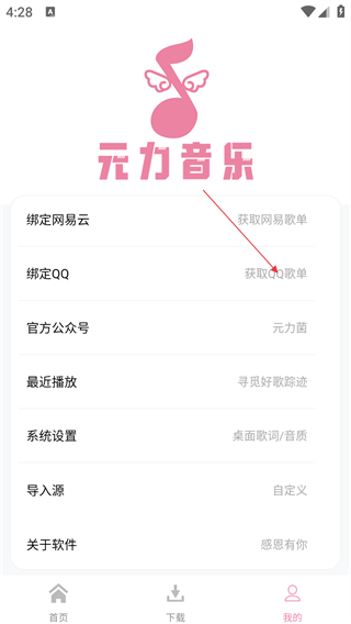 2、在个人页面中,找到【绑定QQ】选项,点击【获取QQ歌单】。