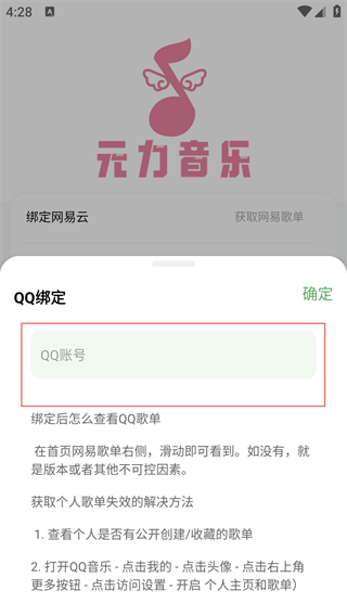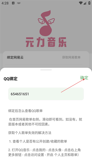 4、输入完成后,点击右上角【确定】按钮,即可完成QQ歌单绑定操作。