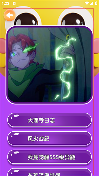 4、在猜谜关卡中,可根据动漫画面选择对应的动漫名称,如从【大理寺日志】【风火战纪】等选项中选出正确答案。