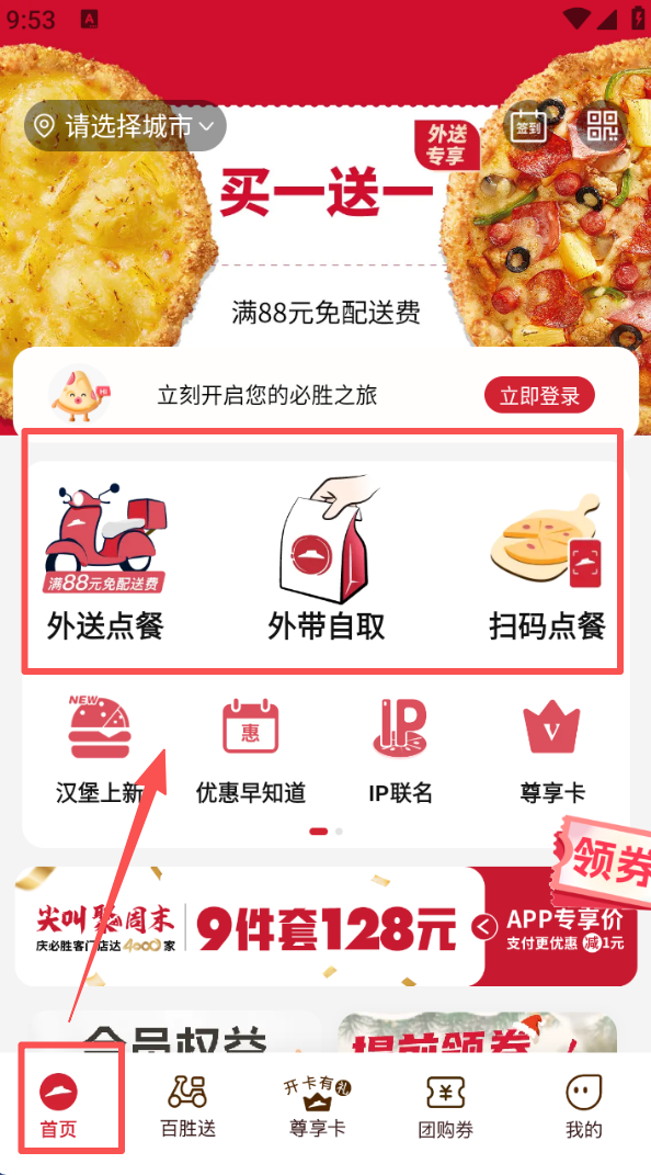 1、打开手机的必胜客软件,点击外送点餐选项。