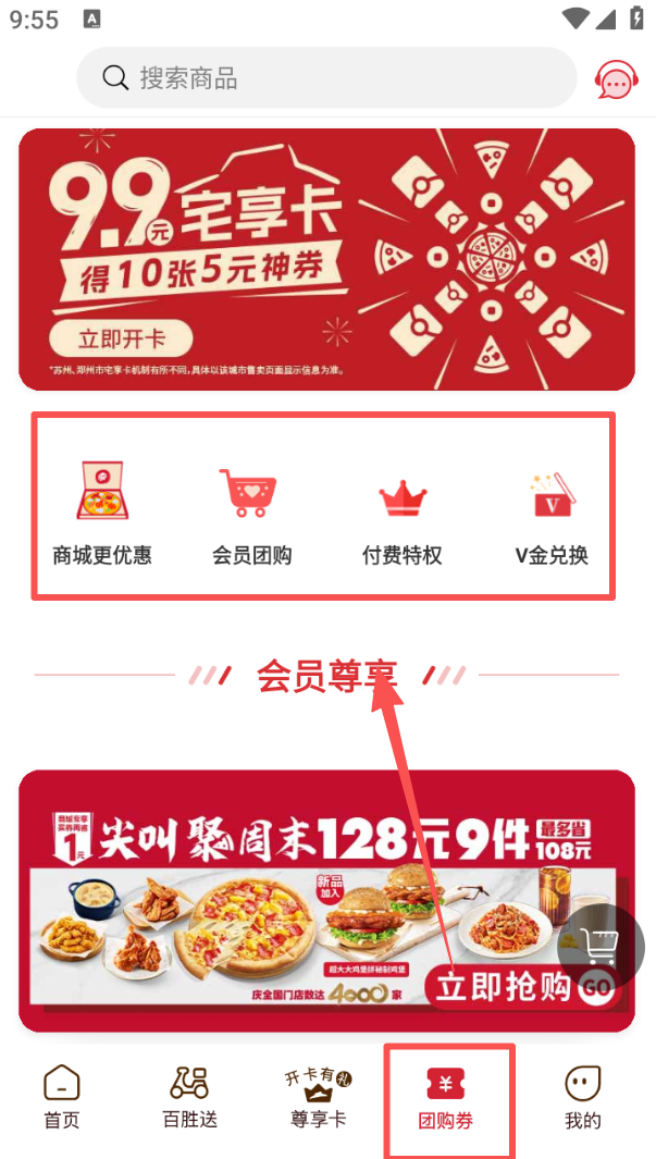 2、切换到团购券页面,在商城更优惠、会员团购等板块,了解宅享卡、套餐等优惠信息。