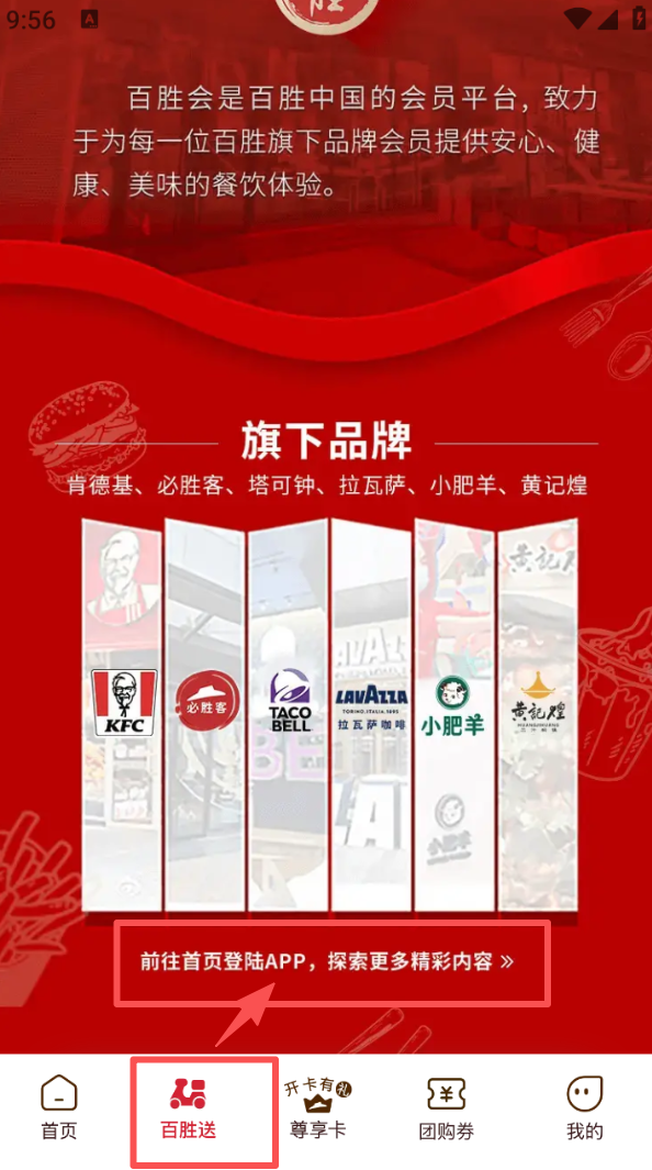 3、打开百胜送页面,查看旗下品牌列表,点击对应入口登录 APP,探索更多餐饮服务内容。