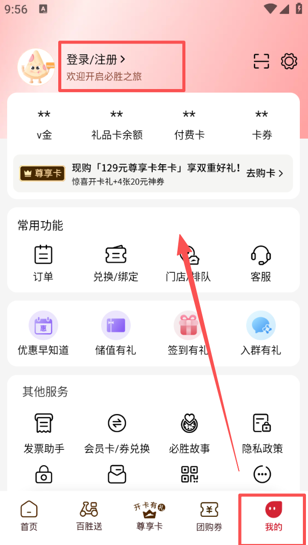 4、进入 “我的” 页面,点击 “登录 / 注册” 完成账号操作,借助常用功能管理订单、卡券等信息。