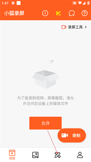 1、在【小狐录屏】主界面,需先点击【允许】授权媒体文件访问权限,完成后点击底部【工具】按钮,可进入视频工具页面。