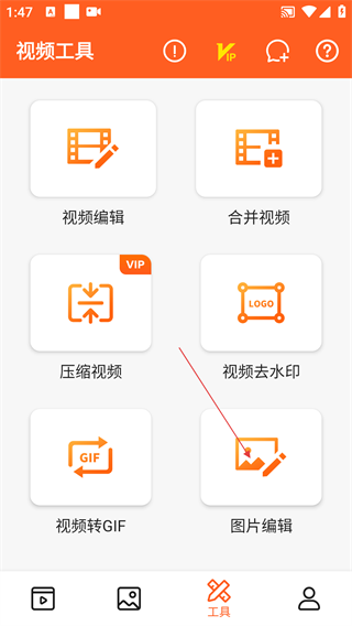 2、在【视频工具】页面,包含【视频编辑】【合并视频】【图片编辑】等功能,点击【图片编辑】