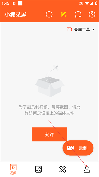 1、在【小狐录屏】界面,先点击【允许】授权访问媒体文件,完成权限申请后,才能使用【录制】功能进行录屏。