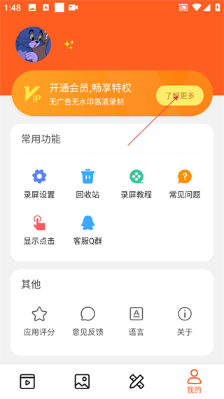 2、进入【我的】页面,可看到【常用功能】板块,包含【录屏设置】【录屏教程】等工具,点击对应选项可使用相关功能。