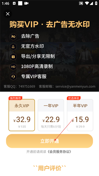 3、点击【了解更多】进入VIP开通页,可查看【永久VIP-32.9元】【一年VIP-22.9元】等套餐,开通后可享无广告、1080P录制等特权。