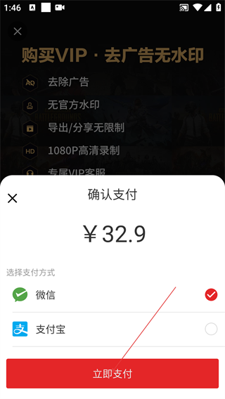 4、选择VIP套餐后进入【确认支付】弹窗,可选择【微信】或【支付宝】作为支付方式,点击【立即支付】完成开通流程。