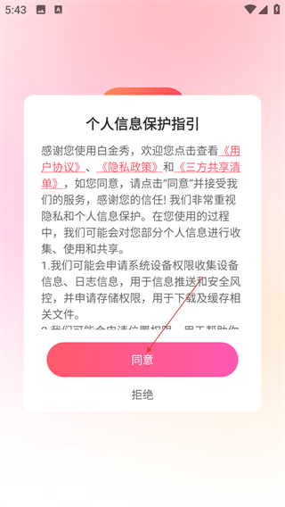 1、使用【白金秀】前,需阅读并同意《用户协议》《隐私政策》和《三方共享清单》,点击“同意”方可继续使用服务。