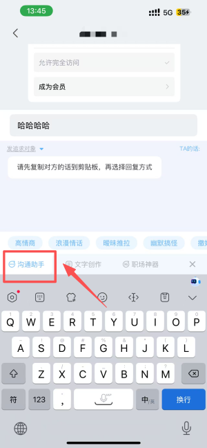 2、点击沟通助手板块,可选择高情商、浪漫情话等分类的沟通话术,辅助交流。