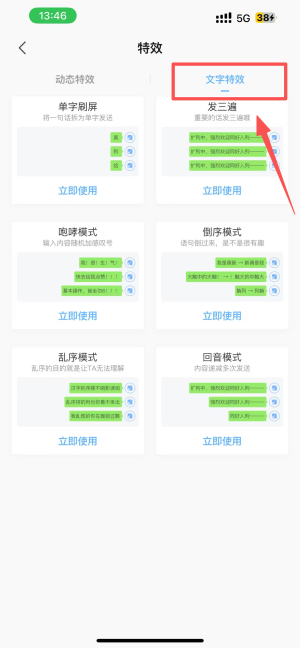 4、在文字特效板块,可选择发三遍、单字刷屏等特效,丰富文字的发送形式。