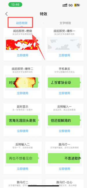3、进入特效界面的动态特效板块,可选择阅后即焚-燃烧等特效,让文字发送更具特色。