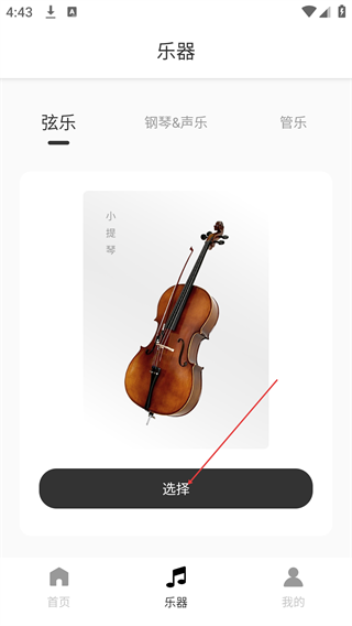 2、在乐器界面选择分类标签(如“弦乐”),找到目标乐器(如“小提琴”),点击“选择”进入该乐器的曲谱列表页。