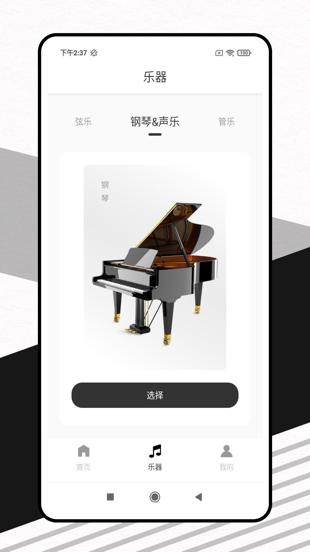 1、在【首页】点击底部导航栏的“乐器”选项,进入乐器分类界面。
