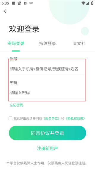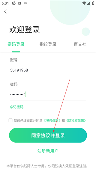 3、在登录页面,输入账号和密码后,勾选同意《服务条款》和《隐私权政策》,点击【同意协议并登录】按钮即可登录。