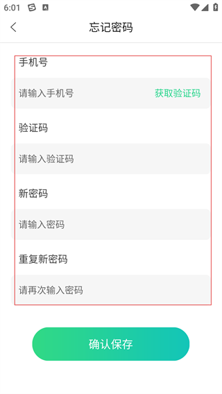 4、在【忘记密码】页面,输入手机号、验证码、新密码及重复新密码后,点击【确认保存】即可完成密码重置。