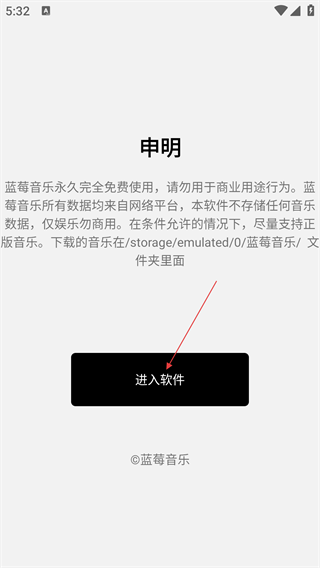 1、在蓝莓音乐申明页面,点击【进入软件】按钮,进入音乐下载器主界面。