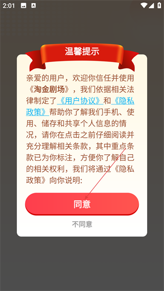 1、打开《淘金剧场》APP后,会弹出【温馨提示】,点击【同意】即可进入APP主界面,开始短剧观看之旅。