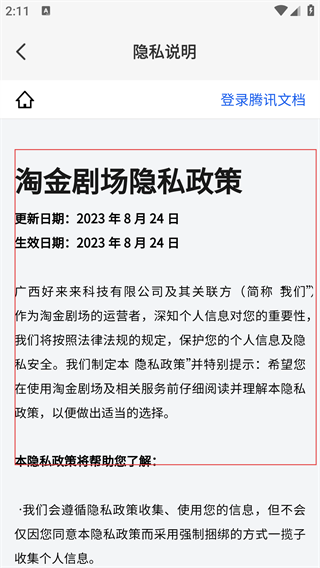 4、在【隐私政策】界面,可查看《淘金剧场隐私政策》的详细内容,了解使用APP的相关条款。